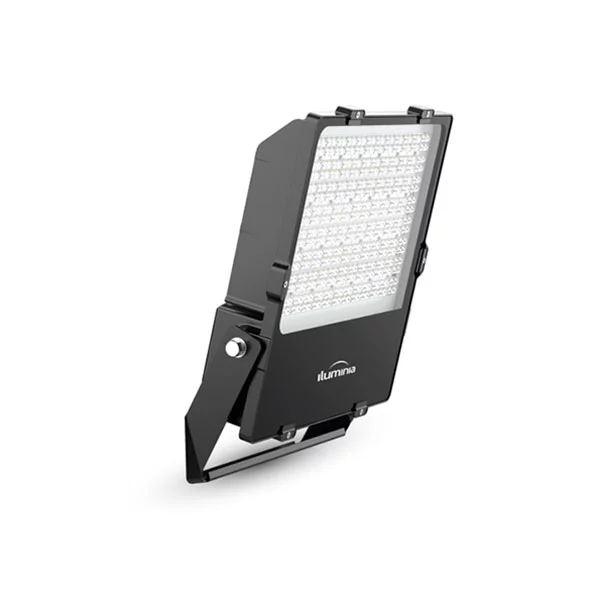 Proyector de alto factor de potencia fabricado en fundición de aluminio termo lacado negro , con cinco opciones de óptica y protección de cristal templado.